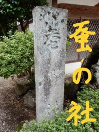 本殿北脇の恵比須神社は、御神体が、光秀の筆による「和久左衛門太夫長利追及下知状」(福知山市指定有形文化財)です。現在、恵比寿神社には、全部で5柱が祀られています。中でもユニークなのが、大正4(1915)年に京都太秦の「蚕ノ社」と呼ばれる木嶋坐天照御魂神社より養蚕大神を迎えて合祀していることです。恵比寿神社の脇には、「蚕乃社」と彫られた石柱が建てられています。福知山で養蚕がいかに大切にされてきたかがうかがえます。