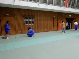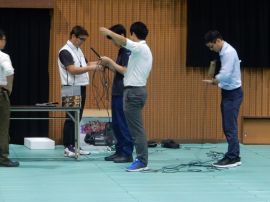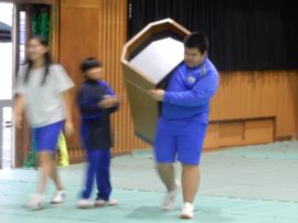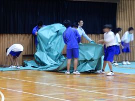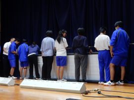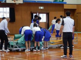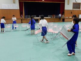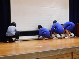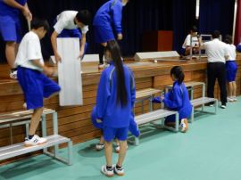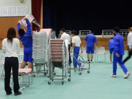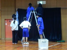 10月20日(月)の放課後に、7~9年生が体育館を文化祭仕様にしました。シートを敷き、暗幕を張り、椅子を運んで並べ、合唱台を組み立て、演台を運び、スクリーンを釣り上げ、舞台用照明を設置し…という多くの作業をテキパキと行いました。