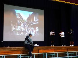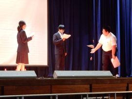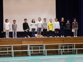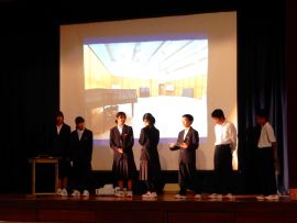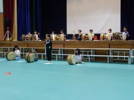 7~9年生がシート敷きなどを行った体育館で、各学年が練習を始めています。演技に必要な身振り手振りを相談しながら工夫したり、入退場の仕方や出入りの方向を確認したりしていて、和気藹々としたな雰囲気の中にも真剣さがうかがえます。