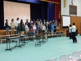 三和学園ニュース7~9年生がシート敷きなどを行った体育館で、各学年が練習を始めています。演技に必要な身振り手振りを相談しながら工夫したり、入退場の仕方や出入りの方向を確認したりしていて、和気藹々としたな雰囲気の中にも真剣さがうかがえます。