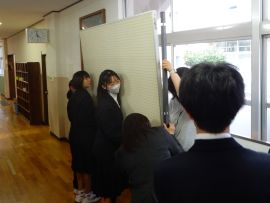 文化祭終了後には、感動の余韻も覚めやらぬまま、5~9年生がテキパキと後片付けを行いました。体育館の椅子や楽器を、放送機器を元の場所に運び、ランチルームや技術室の作品や壁の飾りを取り外してまとめ、本館廊下の作品を外すとともに、展示パネルを分解して倉庫に移動させました。これらが終わると、体育館床に敷かれたシートを剥がし、最後にモップ掛けを行いました。