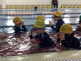 入学して初めて、あるいは一年振りの水泳学習ということで、まずは入念に水慣れを行いました。プールサイドに座り、バタ足で大きく水しぶきを上げ、プール内を大きく回った後、水に顔をつけたりビート板を使って浮く練習をしたりと、段階を踏んで学習を進めていきました。皆、意欲的に学習に向かっていて、感心しました。