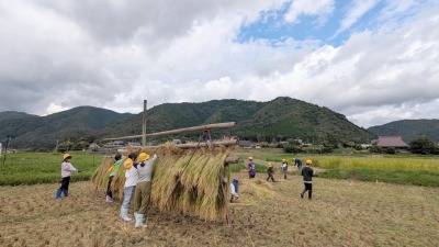 みんなでわいわい稲木をたてて、稲木干しの完成!
