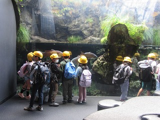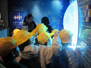 本日、1年生と2年生がバスで園部駅まで行った後、電車に乗って京都水族館に行きました。