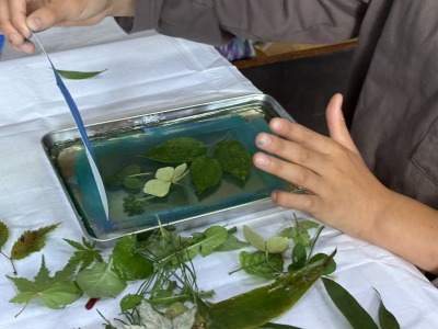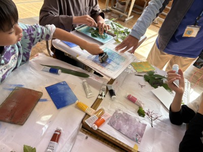 「ジェルプリント」という技法を使って、季節の植物を版画にします。
