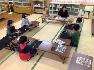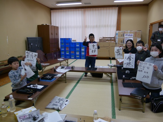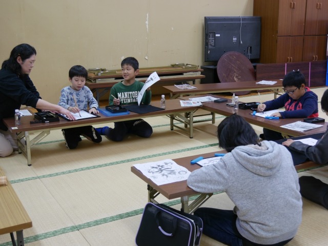 墨は真っ黒だけじゃないこと、墨のすり方で色の濃さが違うことなどを楽しみながら学びました。まだ、お習字セットを持っていない低学年の子どもたちも一緒に、自分だけのオリジナルの薄墨で、文字や絵をかいて、墨に親しむことができました。