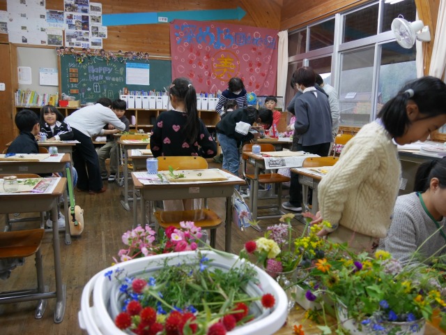 サークルの皆さんがそれぞれに近所の花をたくさん持ち寄ってくださり、教室は花いっぱいに!