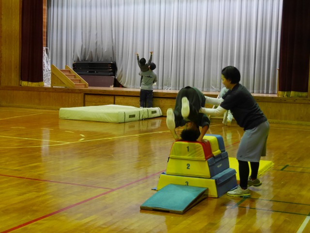 ステージの上から後ろ向きに宙返りをしたり、壁を使って逆立ちで歩いたり、プロに補助をしてもらいながら、上手な身体の使い方のコツを教わりました。