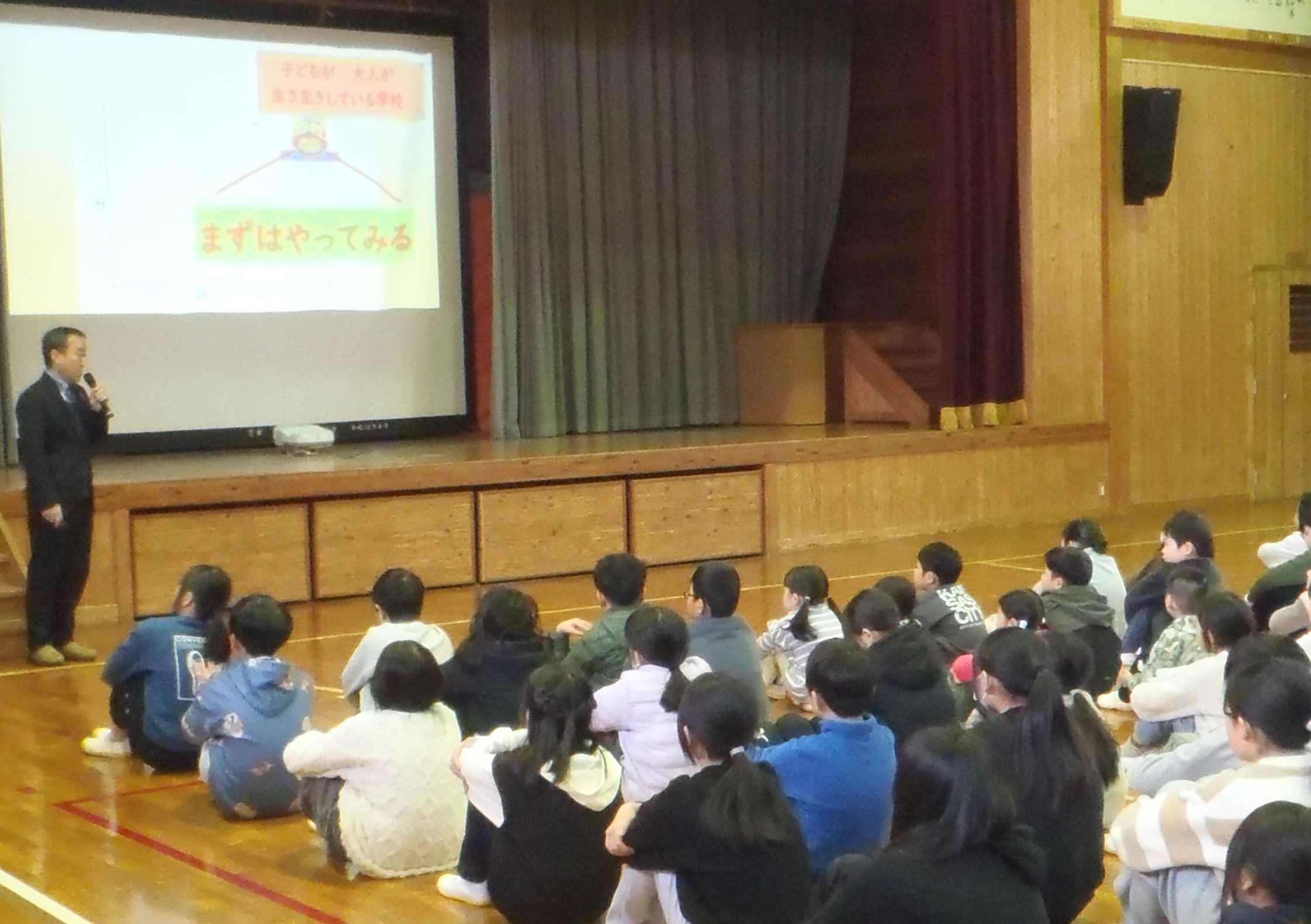 始業式では、校長先生が「3学期も"好き"を大切に、得意を生かして自分を成長させましょう。"子どもが、大人が生き生きしている学校"を実現するために、まずはどんなことでもやってみましょう。」とお話してくださいました。