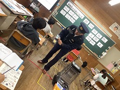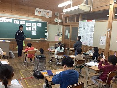 3年生社会科の学習で、「事故や事件からくらしを守る」をしています。その内容の1つに警察の仕事があります。そこで、教科書の内容だけでなく、美山の駐在所ではどのようなお仕事をされているのか、宮島駐在所の木下さんをゲストティーチャーに迎え、教えていただきました。京都府内の警察で働く人の人数や、駐在所・交番の数、その違いや、持ち物などを、子ども達は興味深々に聞いていました。