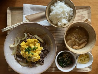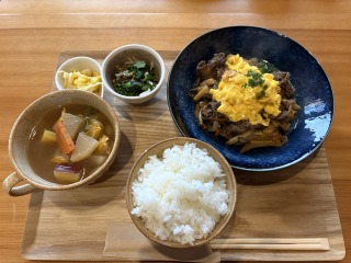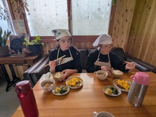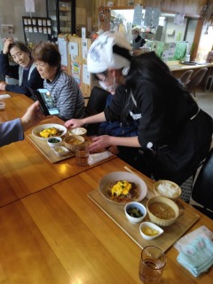 「当日は私たち(グループ)が到着するたびに、生徒さんから丁寧にレシピの説明をしてもらい楽しく食べさせて頂きました。鹿肉も塩麹の味付けで柔らかく匂いもなくて野の味付けも良く、その上のフワフワ卵がトッピングされていて美味しく頂きました。」
