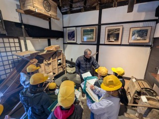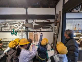 かやぶきの建物の中には、昔の美山で実際に使われていた道具や、子どもたちが当時使用していた教科書などが展示されており、現在の3年生のこどもたちは「これはどうやって使うんやろ?」と想像したり、「今でいうとこれは◯◯やな」と現代の家電に当てはめて使い方を考えたりしていました。