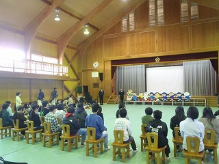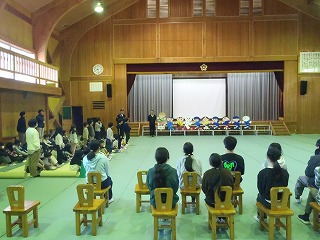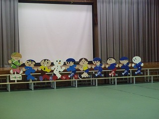 朝、全校集会で、地域に新しく設置する「飛び出し坊や」のお披露目会を行いました。