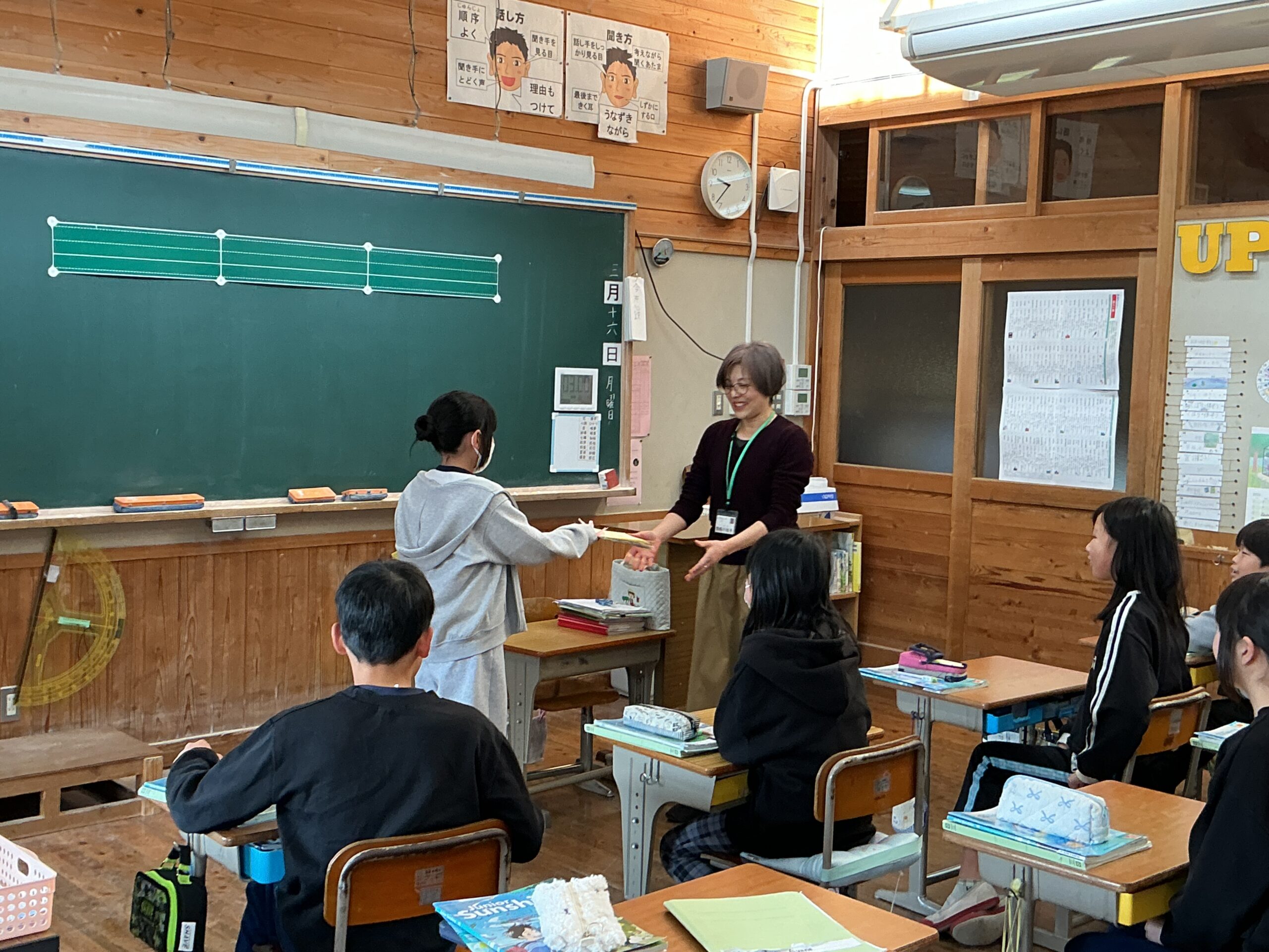 5年生の外国語の学習でALTとしてお世話になった黄楊川先生との授業が、今日で最後となりました。先生には、正しい発音を丁寧に教えていただいたり、外国の面白い文化について教えていただいたりし、毎回の授業を楽しみにしていた子ども達がたくさんいました。「パフォーマンステストに向けてたくさんアドバイスをしていただいた。」「授業前の元気な『ハロー!』という挨拶で頑張る気持ちになった。」等、子ども達の温かい気持ちを込めたお手紙をプレゼントしました。1年間、黄楊川先生のおかげで子ども達は楽しく学ぶことができました。ありがとうございました!!