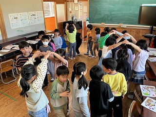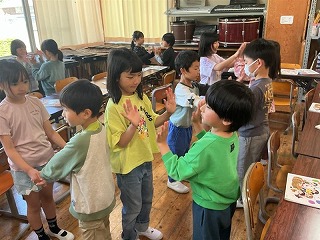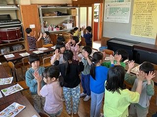 美山っ子日記今日は、1・2年生で合同音楽をしました。まず発声練習では、2年生が発声練習する姿を見て、1年生も一緒に声を出していました。次に2年生が、1年生のために、校歌を歌ってくれると、「入学式に聞いた歌や!」と1年生は嬉しそうにしていました。「セブンステップス」に合わせて1・2年生のペアで手をつないだり、手拍子をしたりしました。また、「ロンドン橋」の遊び方を2年生から教えてもらうと、1・2年生で楽しそうに遊ぶことができました。
