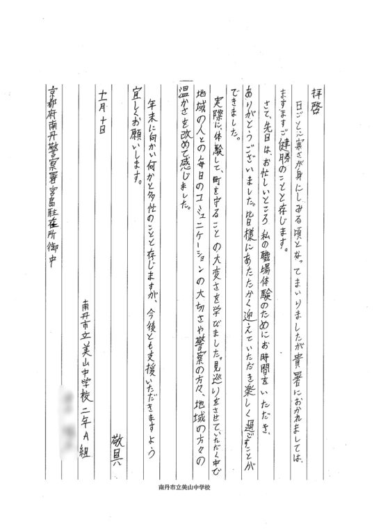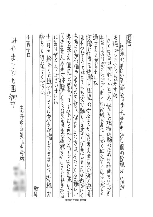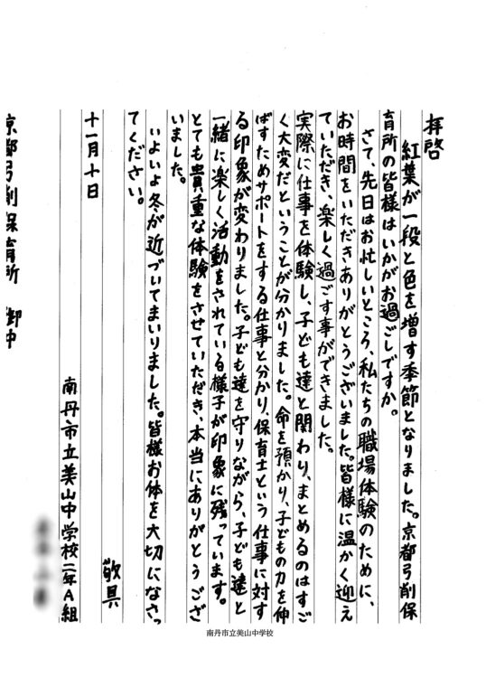 職場体験学習を終え、先日2年生は事業所の方々へ感謝の気持ちを込めたお礼状を作成しました。