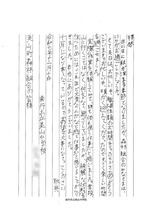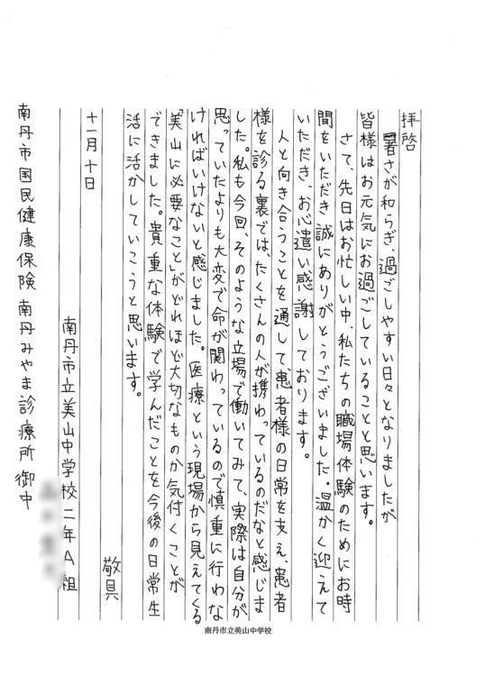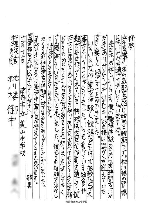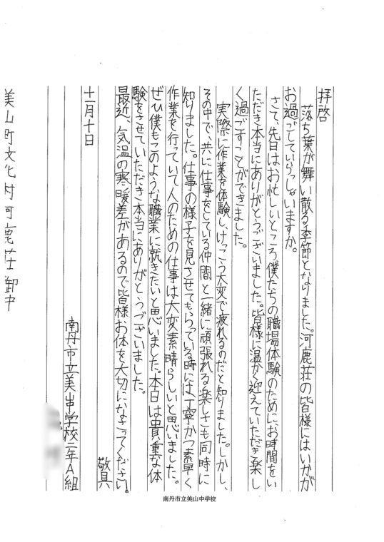 生徒たちは、3日間の体験で感じたことや学んだこと、そして感謝の気持ちがしっかりと伝わるよう時間をかけて文章を綴りました。