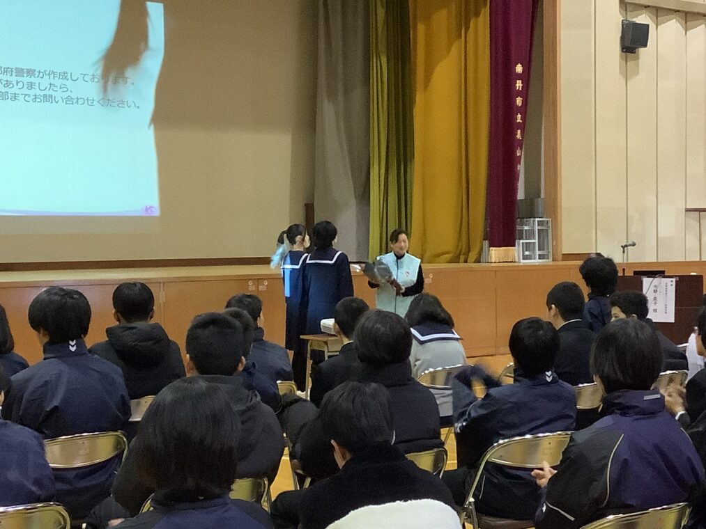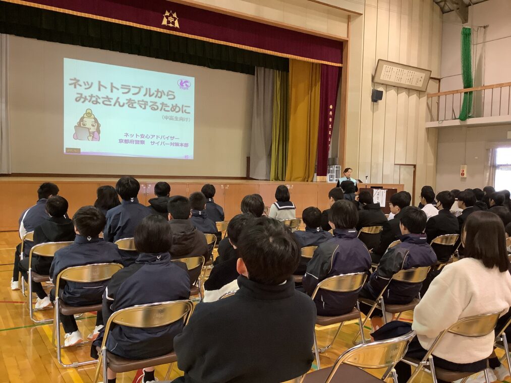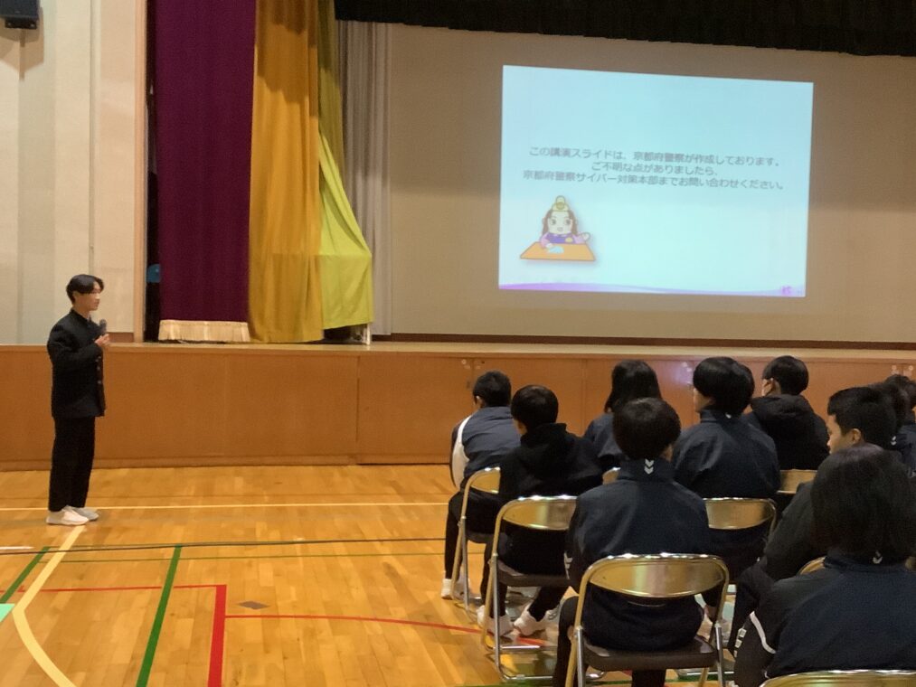 12月9日(金)に京都府警から3名の講師におこしいただき、「SNS」の取り扱いについて講演をいただきました。間違った使い方をすると自分たちが困ったり、周りの人にも迷惑をかけ被害を与えたりすることを具体例を用いて話していただきました。この学びをもとに「SNS」と正しく向き合い、その便利さを生かしながら、有効に使っていくことの大切さを認識する機会となりました。