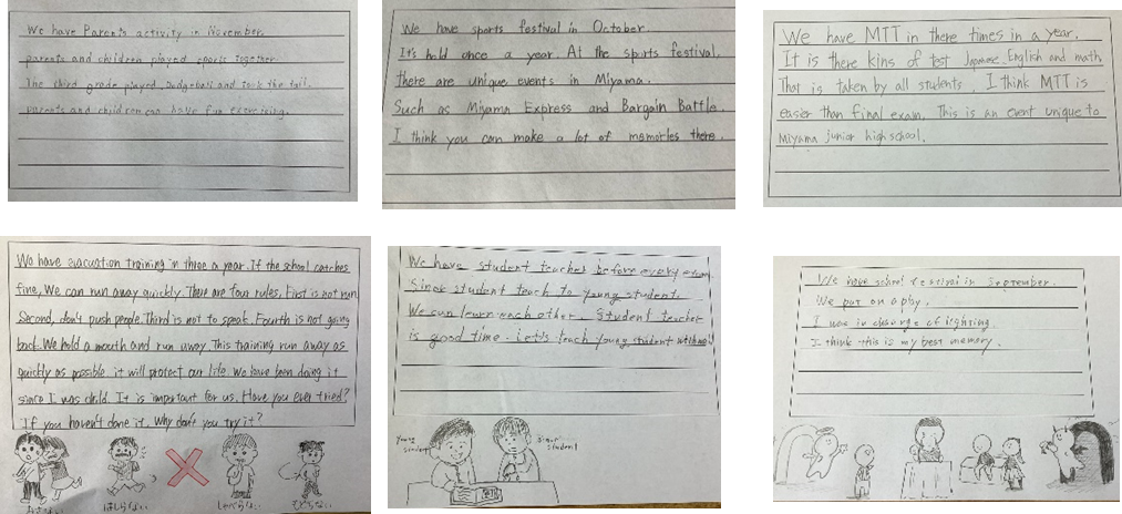 In their English class, the ninth-grade students tried to writing sentences for a website to promote our school. They focused on introducing unique events at Miyama Junior High School. These writing are posted below. Please take a look!