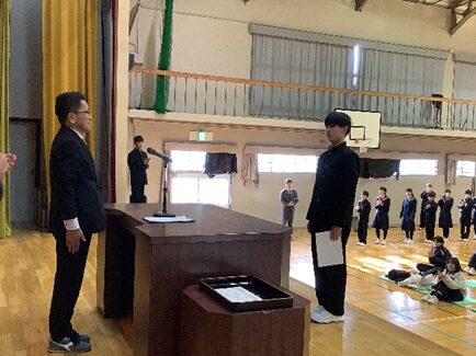 始業式終了後には、本校の取組であるMTT(美山中統一テスト)の表彰を行いました。学習における日々の積み重ねが、確かな成果として表れています。