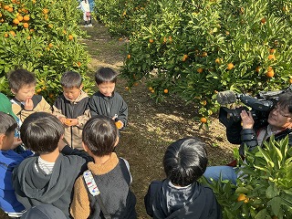 学校の様子1年生とひまわり学級のみんなで、楽しみにしていたみかん狩りを行いました。地元の農園の方に教えてもらいながらみかんを収穫し、「甘い!」「おいしい!」と大喜びで味わっていました。小さくて色の濃いみかんが特に甘いことを知り、ふるさとの特産物のよさにふれる貴重な時間となりました。