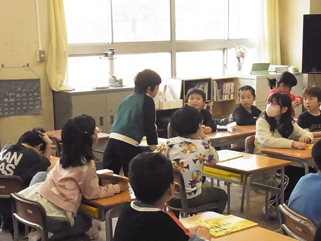 朝の時間を使って、お話し会をしています。一人ずつ、自分の話したいことを決めて話します。今日は「カメを持ってきました。」とみんなに見せてあげようとお家のカメを見せてくれる子がいました。話のあとには、「買ったんですか?」「エサはなんですか?」等、友達の話に興味をもっておたずねができました。新しい学級でも、何でも言い合える、何でも聞いてもらえるあたたかい学級風土を大切にしていきます。