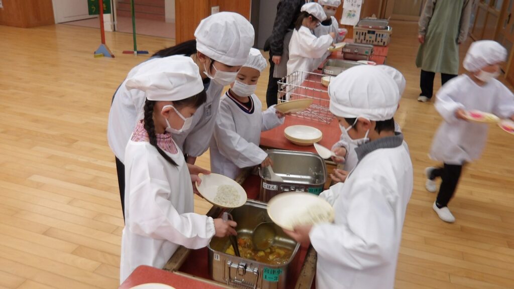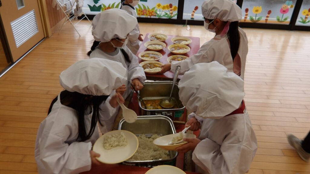 今日は、1年生が初めての給食を食べました。準備から片付けまで、できることをやってみました。6年生も手伝いますが、1年生ができるように支えてくれました。「やってあげる」ことだけではなく、どうすれば1年生が「できた!」という気持ちをもてるのかを考えて、お手伝いしてくれる6年生も、一生懸命がんばる1年生もとっても素敵でした。