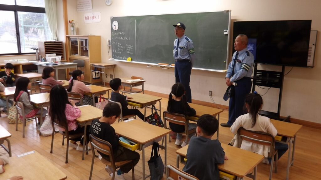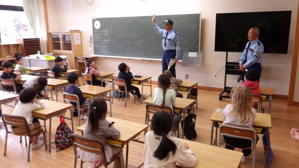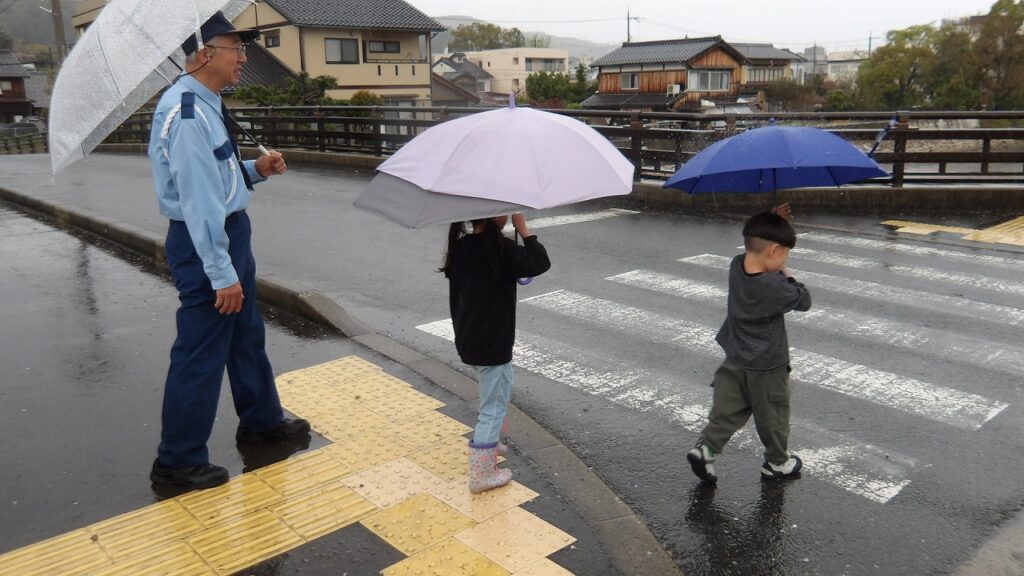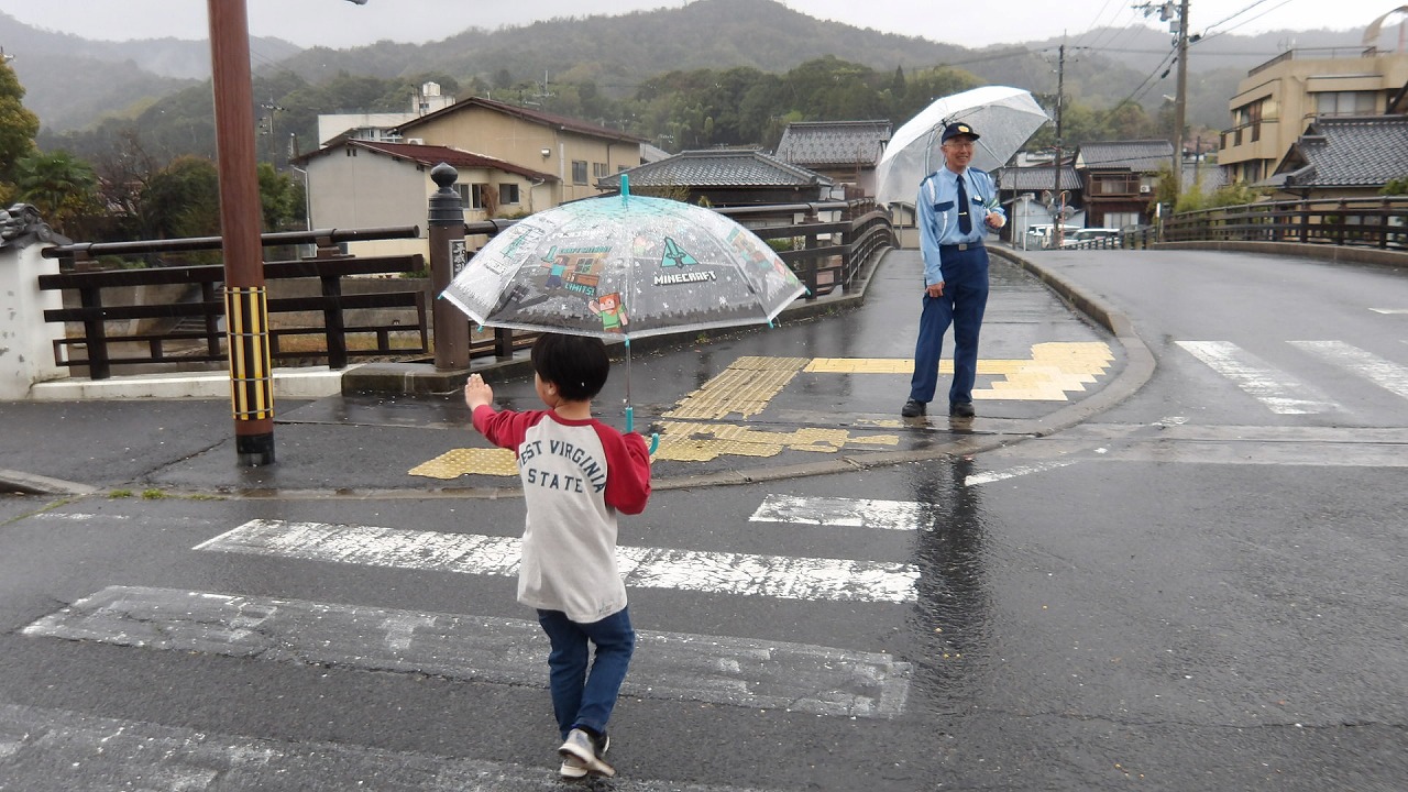 先日、1年生の交通安全教室を行いました。交通安全指導員さんのお話を聞き、実際に学校周辺を歩いてみました。雨の中だったので、かさを差しながら歩く練習もできました。横断歩道を渡るときには上手に左右を確認できました。登下校の時も、学んだことを生かして、安全に歩けるといいですね。