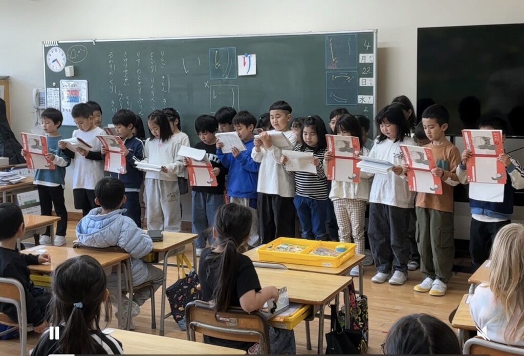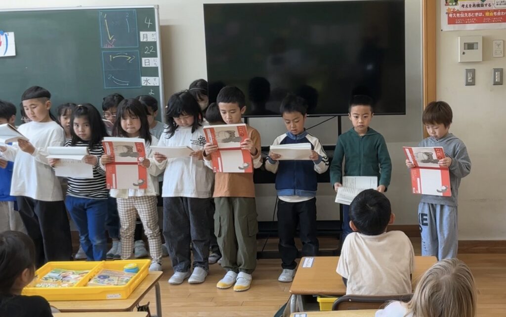 学校の様子2年生が国語で学習した「ふきのとう」の音読を1年生に発表しました。一人ずつ、役割を決めて音読しました。緊張しながらも、今までの学習の成果を出してがんばる2年生でした。聞いてくれた1年生が「一生懸命練習して、発表してくれて、ありがとう」「とても上手だった」「楽しかった」等とすてきな感想を伝えてくれました。1年生も2年生も、笑顔いっぱいの発表会となりました。