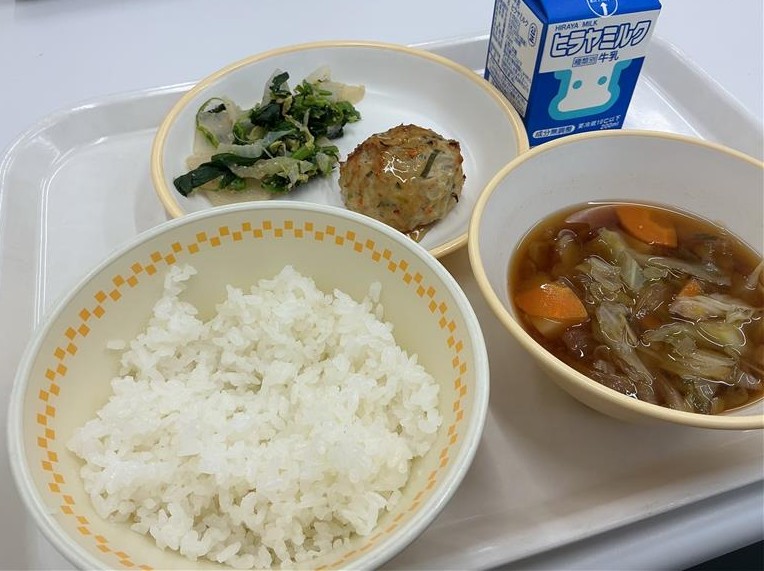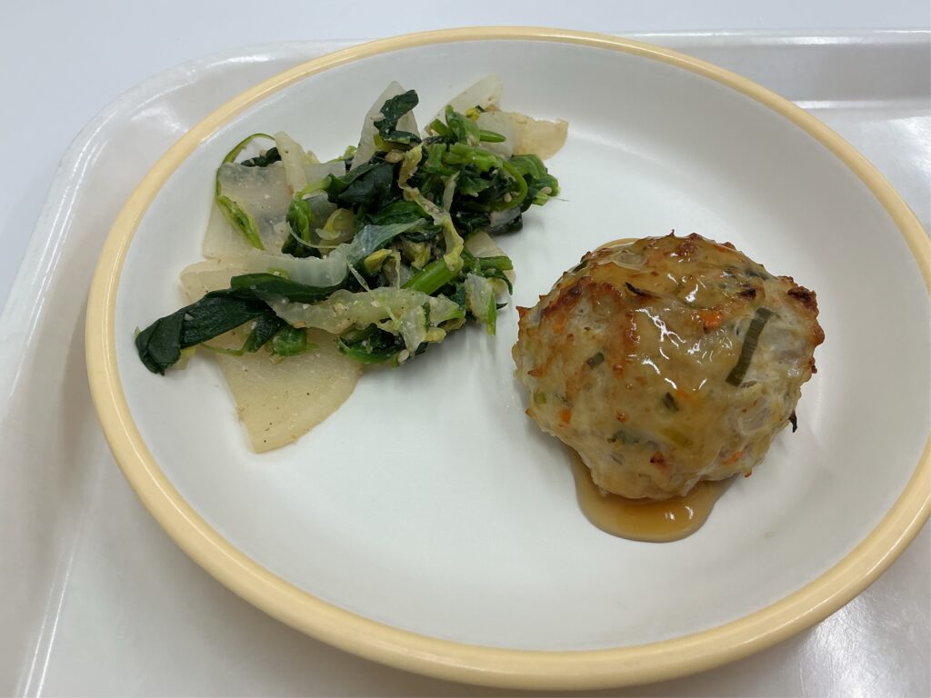 未分類【4月28日(火)】今日の給食は ごはん、鶏つくね焼き、ほうれん草のごま和え、春キャベツのみそ汁、牛乳 です。鶏つくね焼きは鶏ミンチ、細かく切ったにんじん、ごぼう、ねぎを混ぜてハンバーグのように成形して焼いたものです。甘辛いたれもつけます。センターでは約1000食作ってもらっているのですが、1000個も丸めているとは思えないくらいきれいな形のつくねです。食感もふんわりして、たれと合っておいしかったです。毎日丁寧に調理をしていただいています。感謝をしていただきたいですね。
