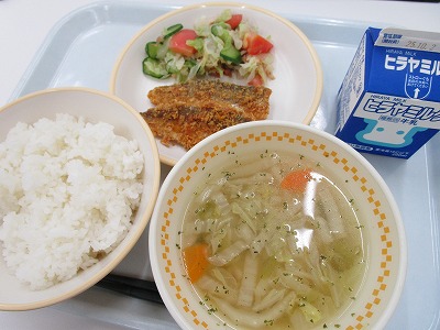 ・ご飯 ・クリスピートビウオ ・トマトときゅうりのサラダ ・じゃがいものスープ ・牛乳