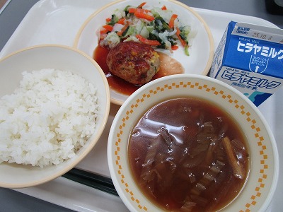 ・ご飯 ・肉団子のコーン蒸し ・キャベツのサラダ ・たまねぎのみそ汁 ・牛乳