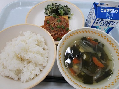 ・ご飯 ・厚揚げのピリ辛あんかけ ・のりのりキャベツ ・豆腐のすまし汁 ・牛乳