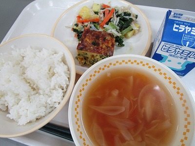 ・ご飯 ・かぼちゃとベーコンのキッシュ ・切干大根のサラダ ・トマトスープ ・牛乳