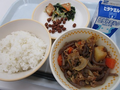 ・ご飯 ・元気肉じゃが ・厚揚げとキャベツのオイスターソース炒め ・ココア豆 ・牛乳