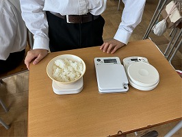 授業後には、給食の時間に、調整したご飯の量を計量できるようにし、生徒が興味を持って確認する姿が見られました。