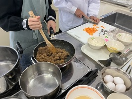 2年生が家庭科の調理実習で、丹後地域の郷土料理である「丹後のばら寿司」を作りました。今回は、班ごとに「まつぶた」と「寿司切り」を使い、本格的に仕上げました。給食でも、端午の節句や宮津祭り、七五三など、お祝いの行事に合わせて、「丹後のばら寿司」を作っています。丹後の素晴らしい食文化を継承し、伝えられる人になってほしいと願っています。