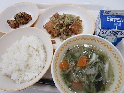 ・ご飯 ・豚肉とチンゲン菜の中華炒め ・中華スープ ・大学芋 ・牛乳