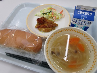 毎日の給食(R7)・コッペパン ・タンドリーチキン ・コーンサラダ ・秋のきのこスープ ・牛乳