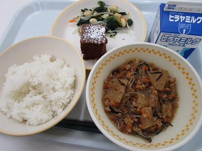 ・ご飯 ・ひじき入りマーボー大根 ・ほうれん草と大豆の中華サラダ ・ごぼうのチョコケーキ ・牛乳