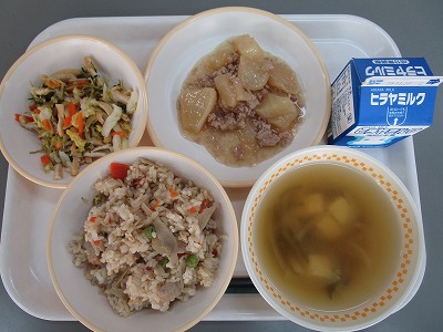 ・鶏ごぼうごはん ・聖護院大根のそぼろ煮 ・白菜の炊いたん ・ゆばのすまし汁 ・牛乳