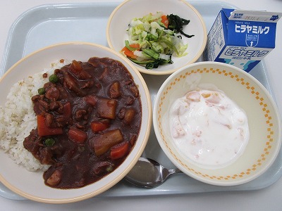 ・秋のハヤシライス ・小松菜のソテー ・国産なし入りフルーツヨーグルト ・牛乳