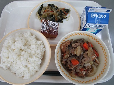 ・ご飯 ・豚肉と大根の煮物 ・春雨の酢の物 ・米粉の黒糖ケーキ ・牛乳