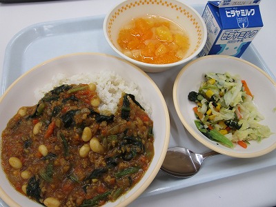 ・ごぼうとほうれん草のキーマカレー ・小松菜のコンソメ炒め ・フルーツポンチ ・牛乳
