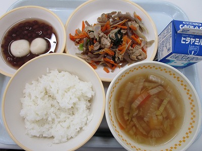 ・ご飯 ・豚肉の五目きんぴら ・けんちん汁 ・白玉ぜんざい ・牛乳