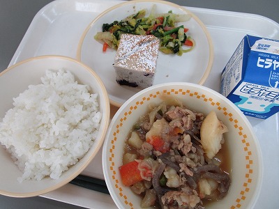 正解は③の7種類でした。今日の肉じゃがには豚肉、玉ねぎ、にんじん、じゃがいも、こんにゃく、切り干し大根、グリンピースが入っています。寒いこの時期には温かい煮物は体を温めてくれます。