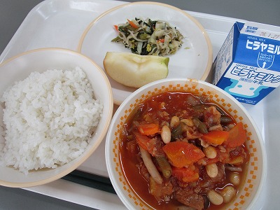 ・ご飯 ・ポークビーンズ ・切干大根の中華炒め ・果物(りんご) ・牛乳