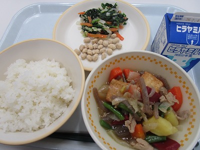 ・ご飯 ・豚肉と赤こんにゃくの煮物 ・はくさいの酢の物 ・きなこ豆 ・牛乳