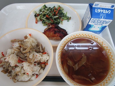 ・深川めし ・鶏肉の照り焼き ・のり入りほうれん草 ・だいこんのみそ汁 ・牛乳