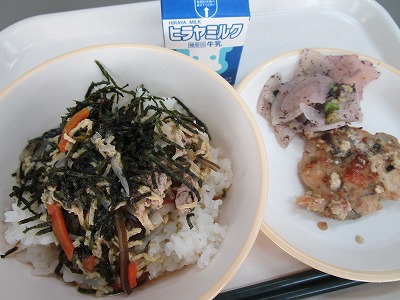 このメニューの他に「世屋みそハンバーグ」「ジャーマンポテト」「宮津ポンチ」を考えてくれましたが、今日はその中から「栄養満点出汁茶漬け風」を給食で取り入れています。
